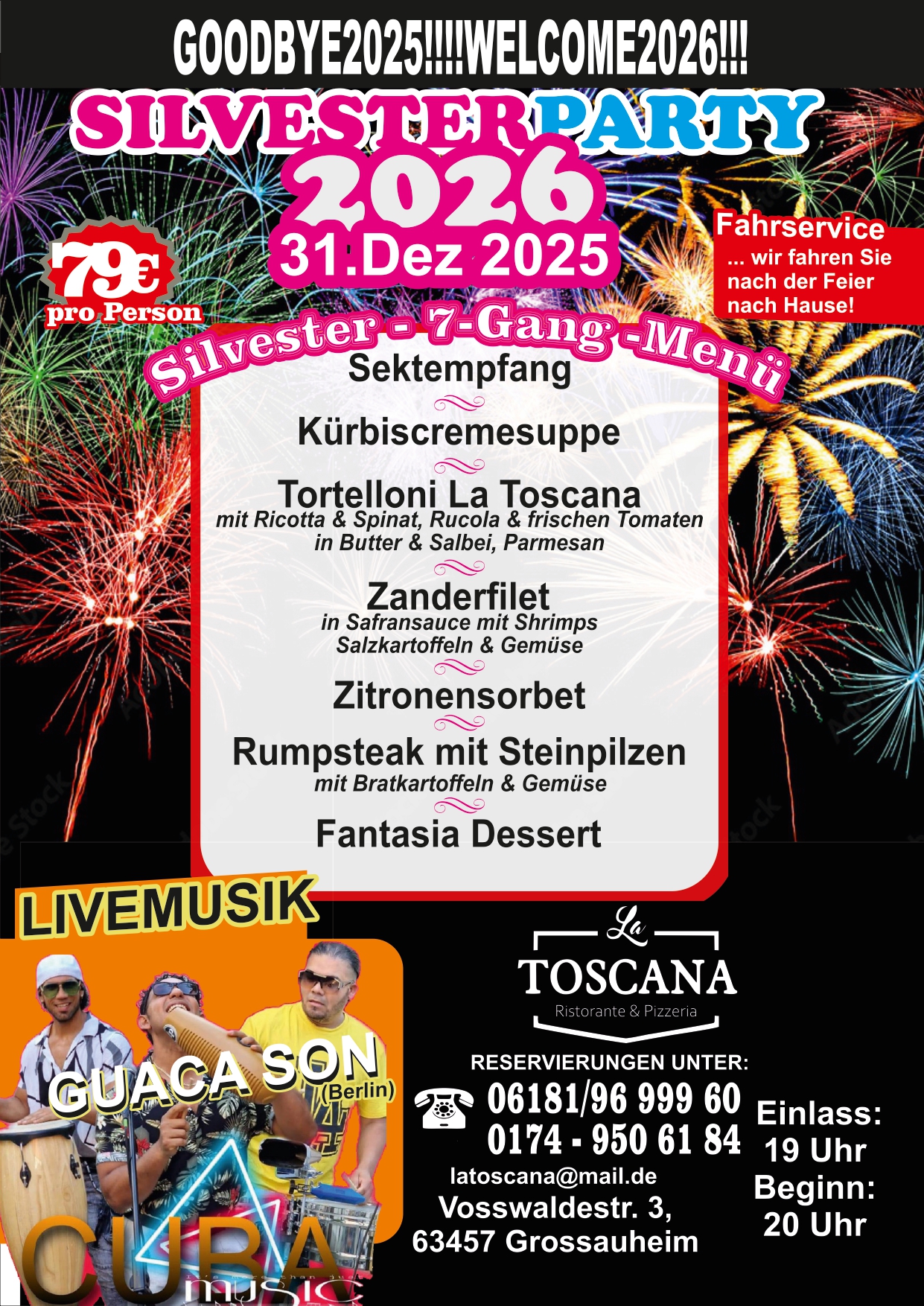79 € pro Person inklusive Heimfahrservice!!!!! 🎆 Einladung zur Silvesterparty 2026!! 🎆 im Ristorante La Toscana Grossauheim Feiere mit uns den Jahreswechsel auf italienische Art – mit Genuss, Musik und guter Laune! Am 31. Dezember 2025 laden wir dich herzlich zu unserer festlichen Silvesterparty ein. Freu dich auf ein exklusives 7-Gänge-Menü, liebevoll zubereitet von unserem Küchenteam, und erlebe die Nacht mit kubanischer Livemusik, die für echte Urlaubsstimmung sorgt. 🥂 Wann: Mittwoch, 31. Dezember 2025, ab 19:00 Uhr 🍽️ Wo: Ristorante La Toscana 🎶 Musik: Kubanische Liveband ✨ Highlight: Mitternachtssekt & Feuerwerk & 7 Gang Menü Lass uns gemeinsam auf ein neues Jahr voller Glück, Gesundheit und Erfolg anstoßen! Reservierungen werden ab sofort entgegengenommen – die Plätze sind begrenzt. Buon anno nuovo! – Feliz año nuevo! – Frohes neues Jahr!